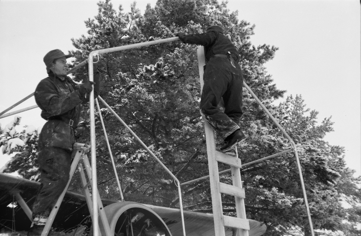 Skyddstält för flygplan Gloster Gladiator sätts upp vid F 19, Svenska frivilligkåren i Finland, 1940. Två män i arbete. Närbild.