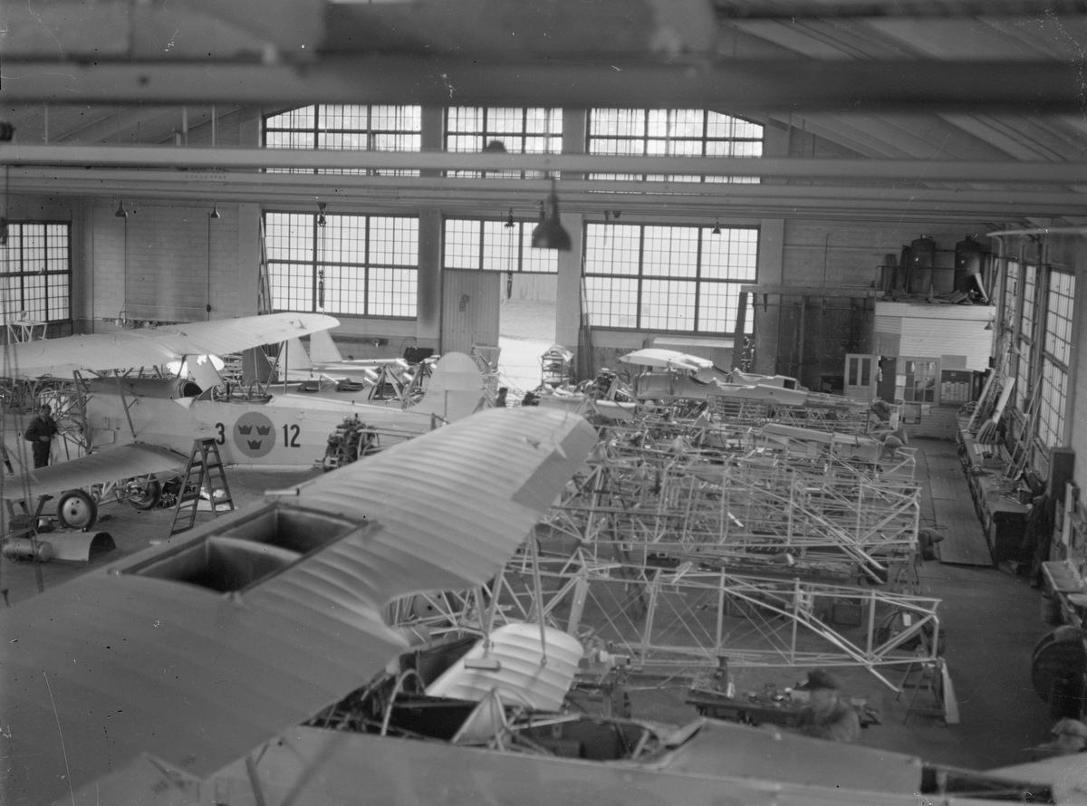 Montering av Fokker-flygplan i hangar på Centrala verkstaden Malmslätt. Till vänster syns en man arbete med flygplan S 6 märkt 3-12.