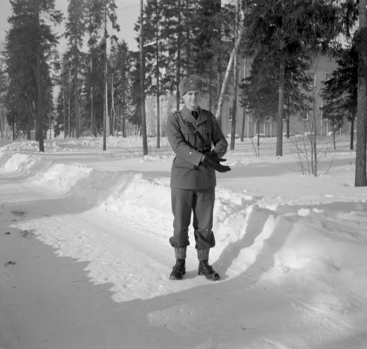 Porträtt av militär tillhörande Svenska frivilligkåren i Finland, F 19, på en plogad väg.