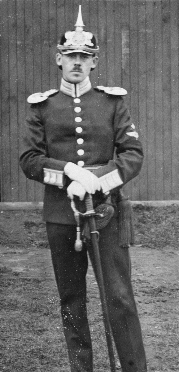 Porträtt av militäre flygföraren Gustaf Stiernspetz från Svea livgarde. Ståendes framför en vägg.