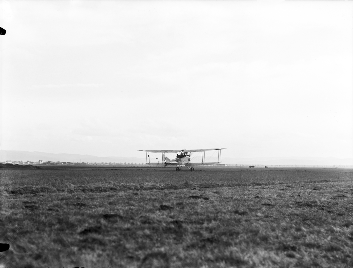 Militärt flygplan Albatros B.I tillhörande Österrike-Ungern startar. Två män i flygplanet. Vy bakifrån.