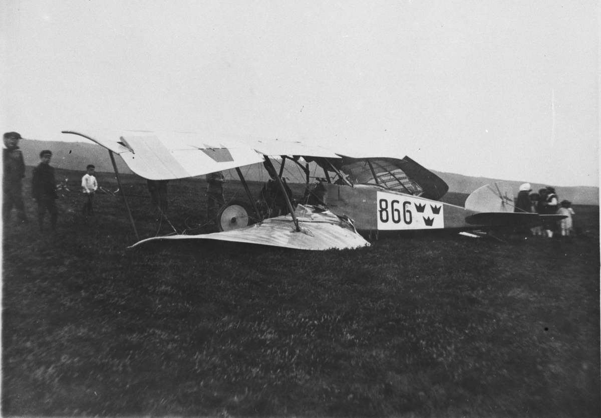 Människor i rörelse kring havererat flygplan Thulin FA nr 866 på Bonarpshed. Besättning Tor von Johnstone och Ragnar Ragnarsson omkom vid ett landningshaveri den 12 augusti 1918, då flygplanet vek sig.