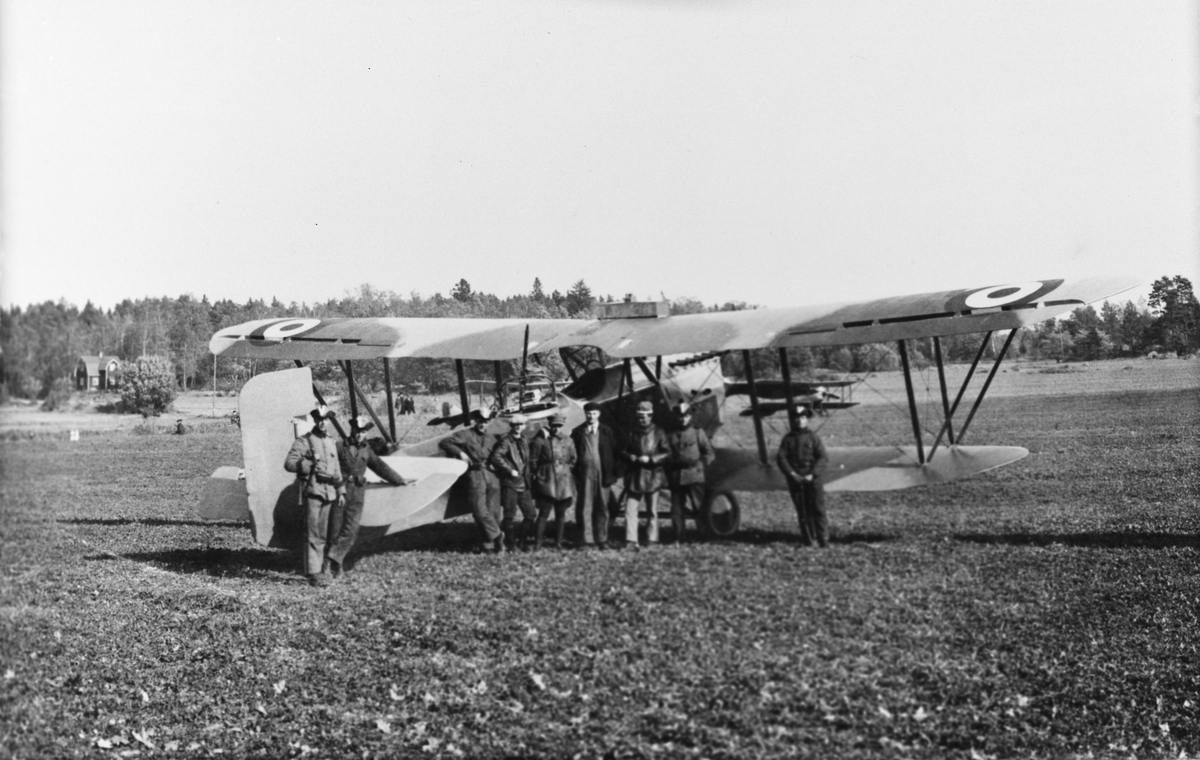 Nio män står framför flygplan FVM S 21 med övningsmärkning vid Upplandsmanövern 1926.