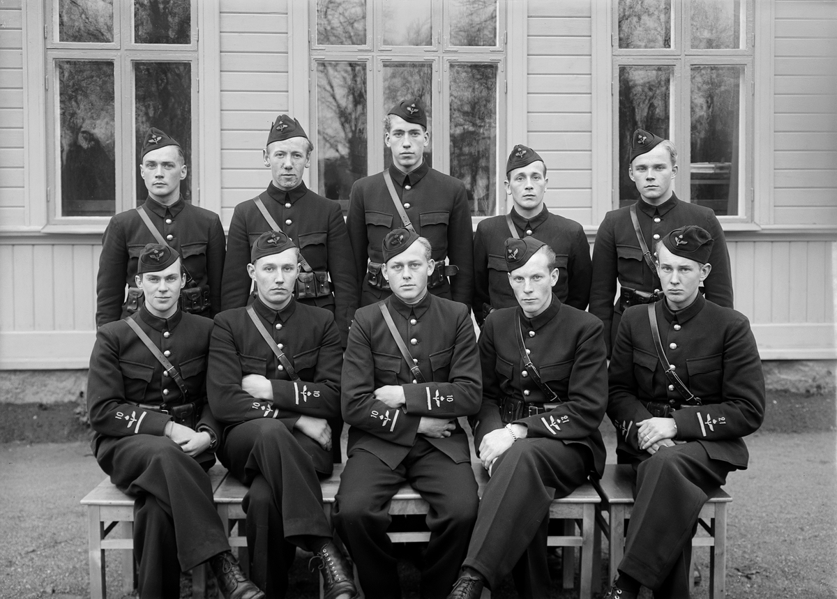 Elever vid korpralskolan för vapensmeder på F 3 Östgöta flygflottilj, 1942. Elever från F 10 och F 21. Grupporträtt framför byggnad.
