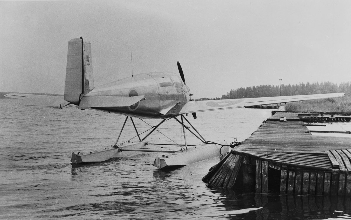 Flygplan Saab 91A Safir nr 91119, förankrad vid brygga på F 2 Hägernäs. Under utprovning av flottörer, omkring 1947. Flygplanet märkt nummer F 9-19. Vy bakifrån.