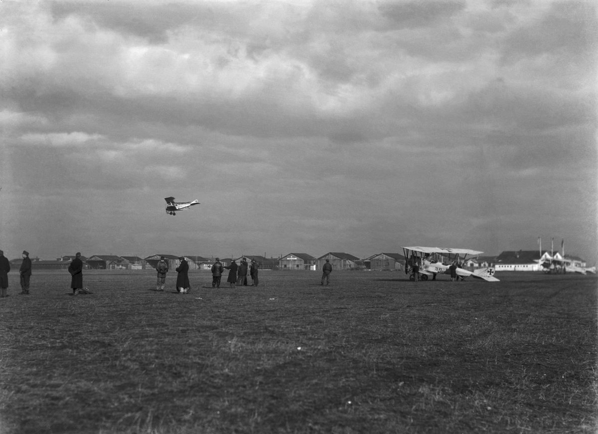 Översikt av militärt flygfält i Österrike-Ungern. Flygplan Lohner B.I märkt 73.03 på väg att landa. På marken står flygplan Lohner B märkt 73.03. Militärer står på flygfältet.