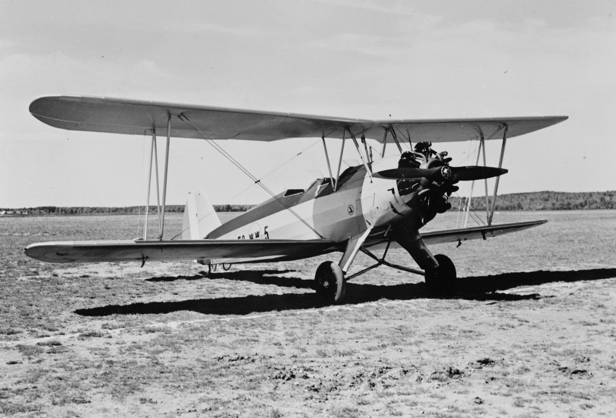 Flygplan SK 12 märkt nummer 59 tillhörande Krigsflygskolan F 5 på ett flygfält. Frontvy.