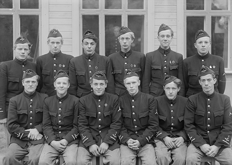Elever vid korpralskolan för flygplansmekaniker på F 3 Östgöta flygflottilj, 1945-1946. Del av klass, tolv stycken elever. Grupporträtt framför byggnad.