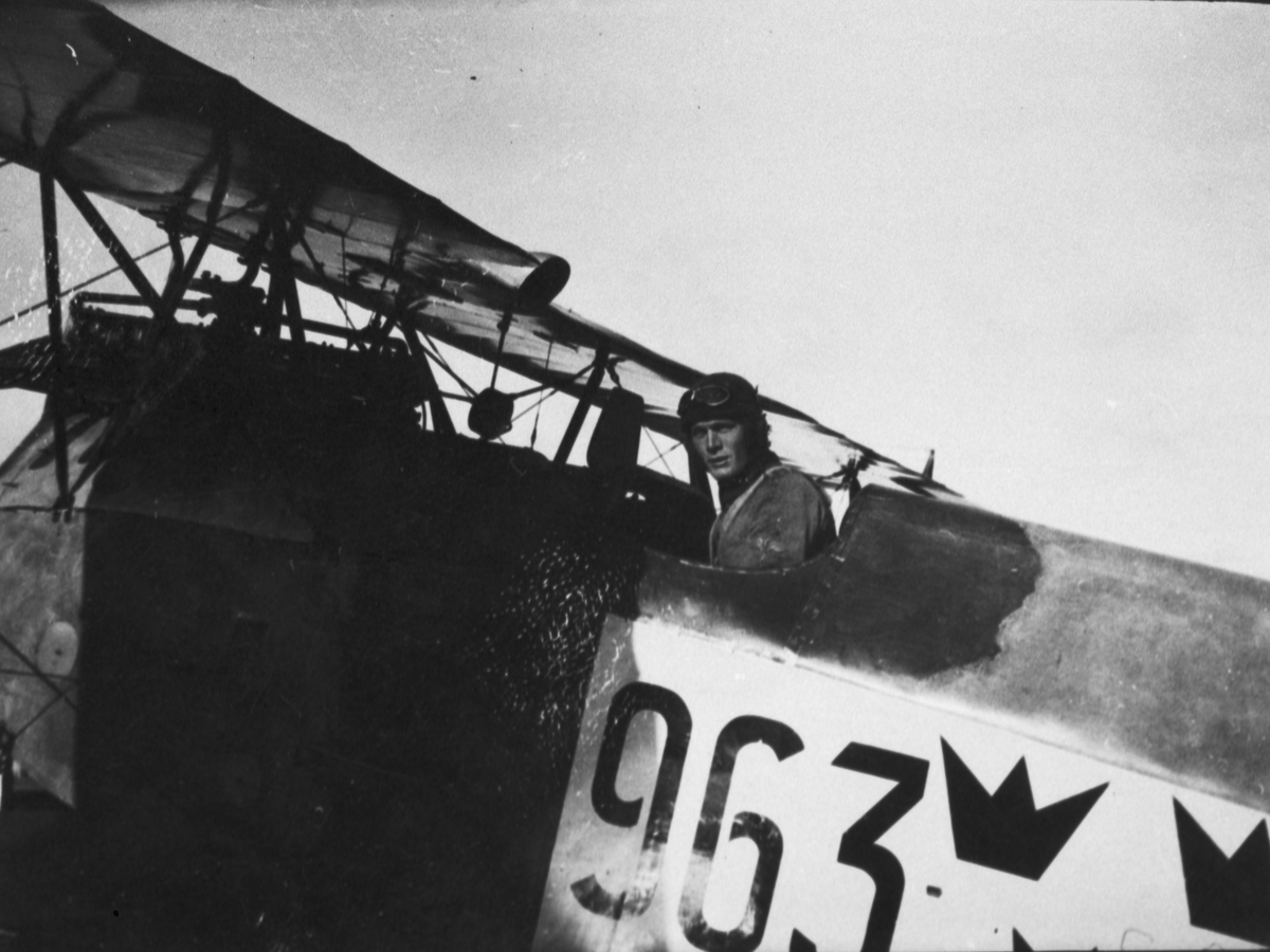 Flygförare Ferdinand Cornelius i flygplan Phönix D.II; Phönixjagaren, nr 963, på flygfältet på Malmen, ca 1920-1921.