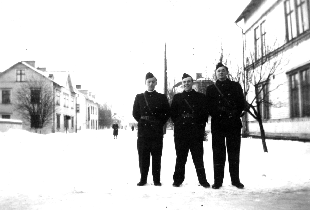 Tre militärer står på en gata i Boden, 1944.