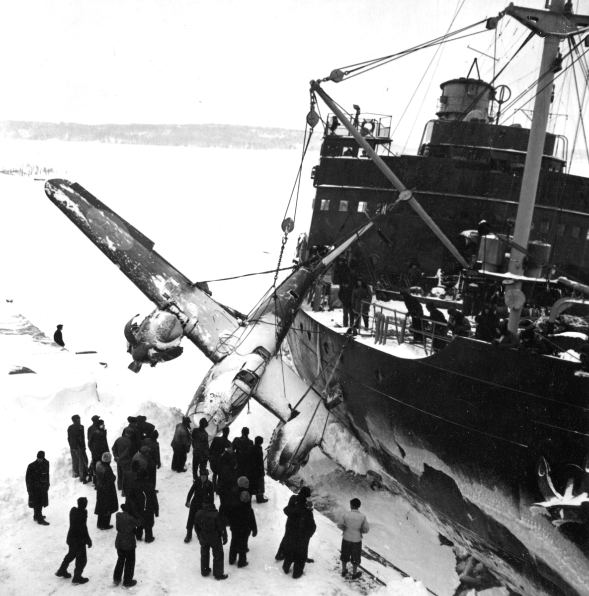 Bärgningsförsök av flygplan B 18B nummer 18172, Röd David i Härnösands hamn med isbrytaren Ymer efter nödlandning på isen den 10 februari 1946.