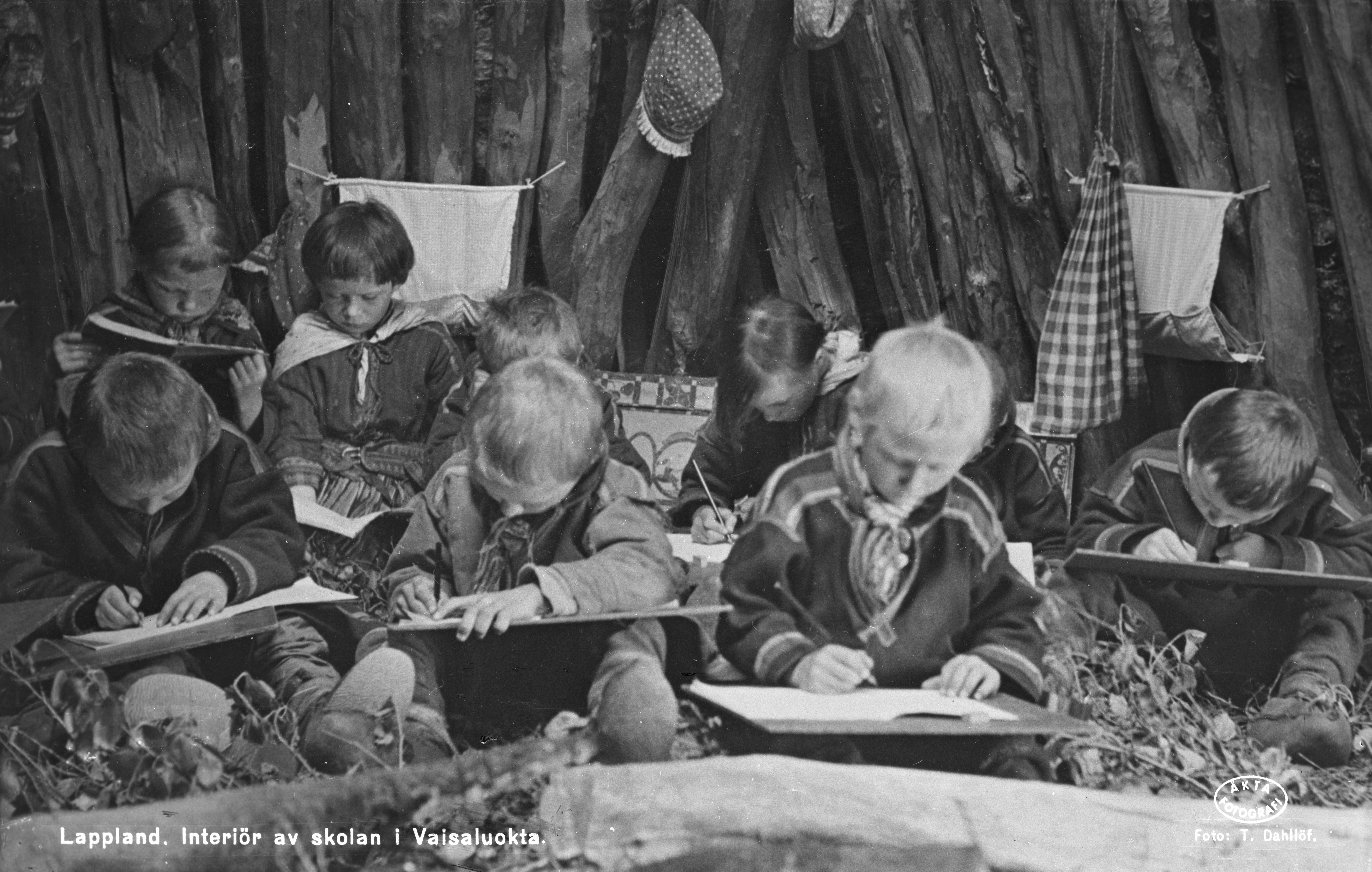 Interiör av skolan i Vaisaluokta med studerande elever.