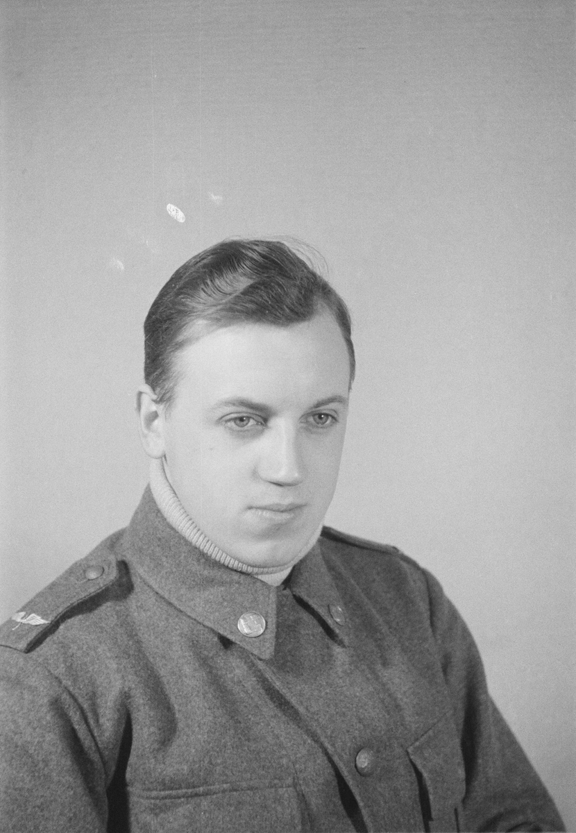Porträttfoto av soldat Åke Gustaf Fritiof Carlsson (nummer 815), mekaniker vid F 19, Svenska frivilligkåren i Finland under finska vinterkriget, 1940.