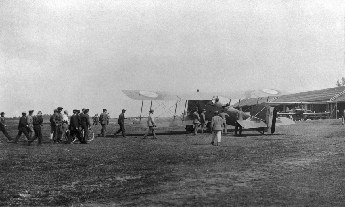 Folksamling kring flygplan Bréguet XIV tillhörig Armée de l´Air vid landning på flygfältet på Malmen, 1919.