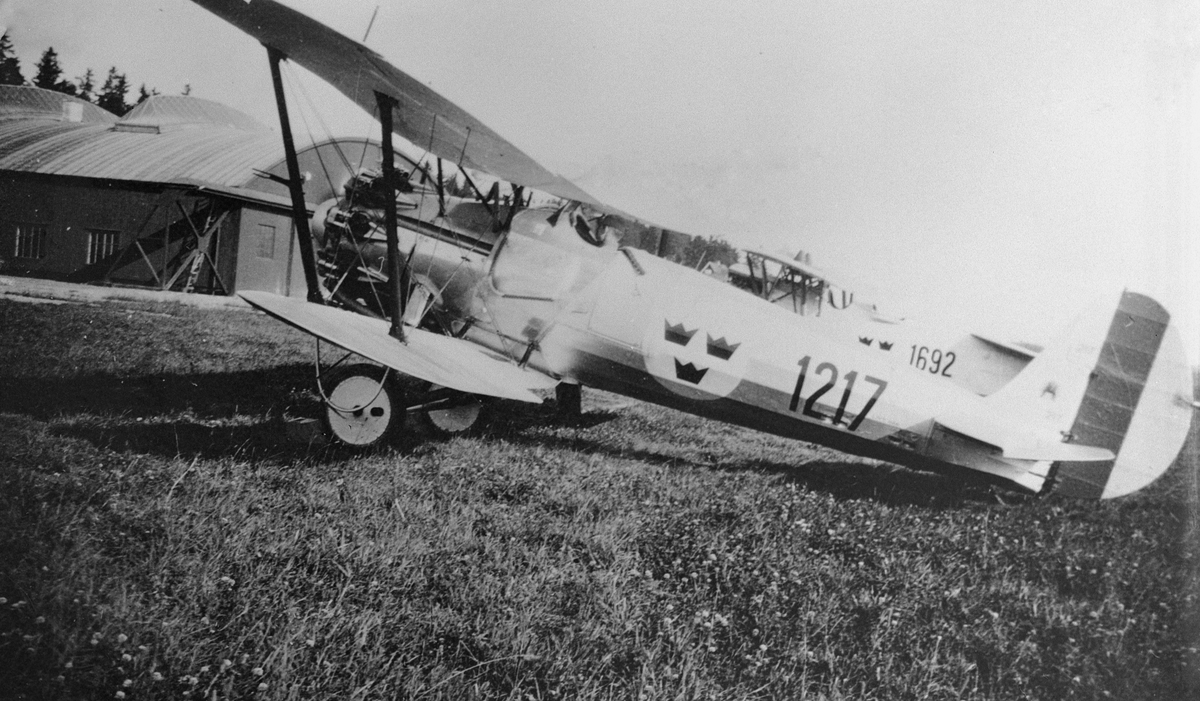 Flygplan J 7 Bristol Bulldog nr 1217 och Phönix Dront nr 1692 står framför hangar på F 1 Västerås, omkring 1932-1935.