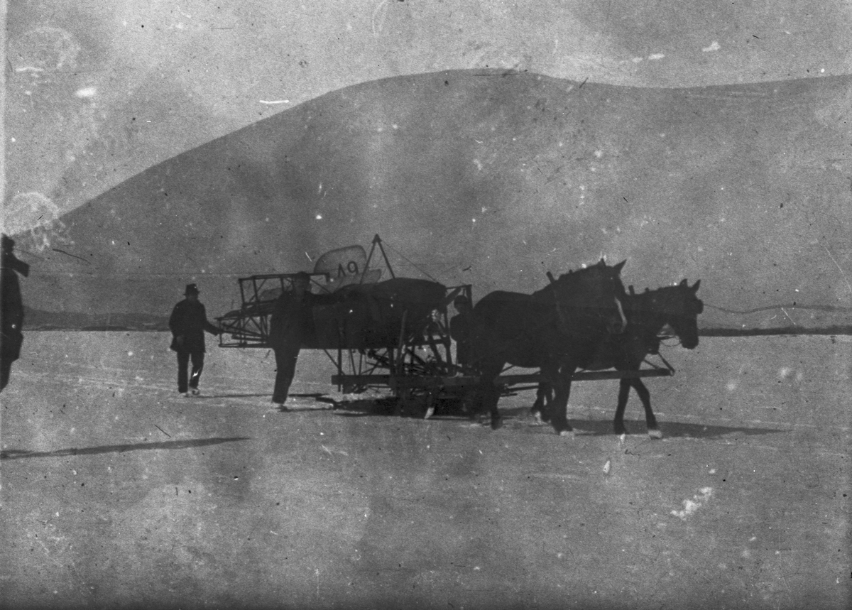 Flygplan Thulin A nr 9 körs bort med hästtransport efter haveri, vintertid. Omkring 1915-1920.