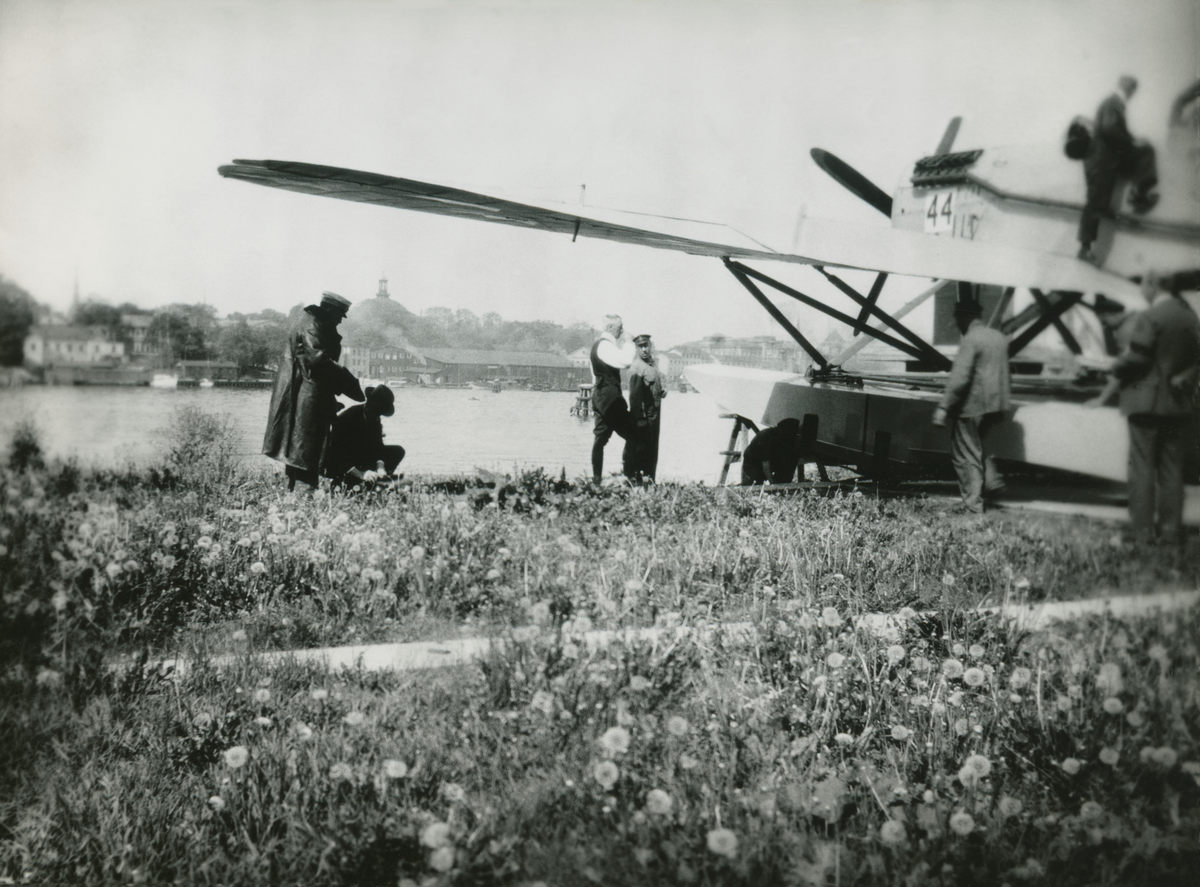 Flygplan Hansa typ 43 / S 3 nr 44 med flottörer står vid vatten, 1925. Sju personer i rörelse vid planet. Mannen i mitten, med vitt hår är Arvid Flory.