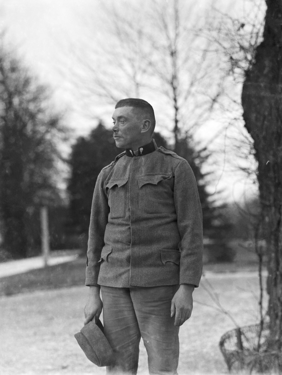 Porträttfoto av militär från Österrike-Ungern, utomhus vid träd under första världskriget. Halvprofil.