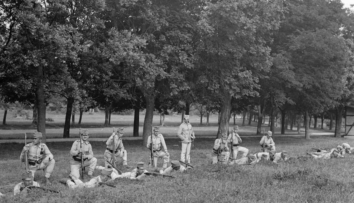 21 militärer från Österrike-Ungern övar liggande skytte med gevär.