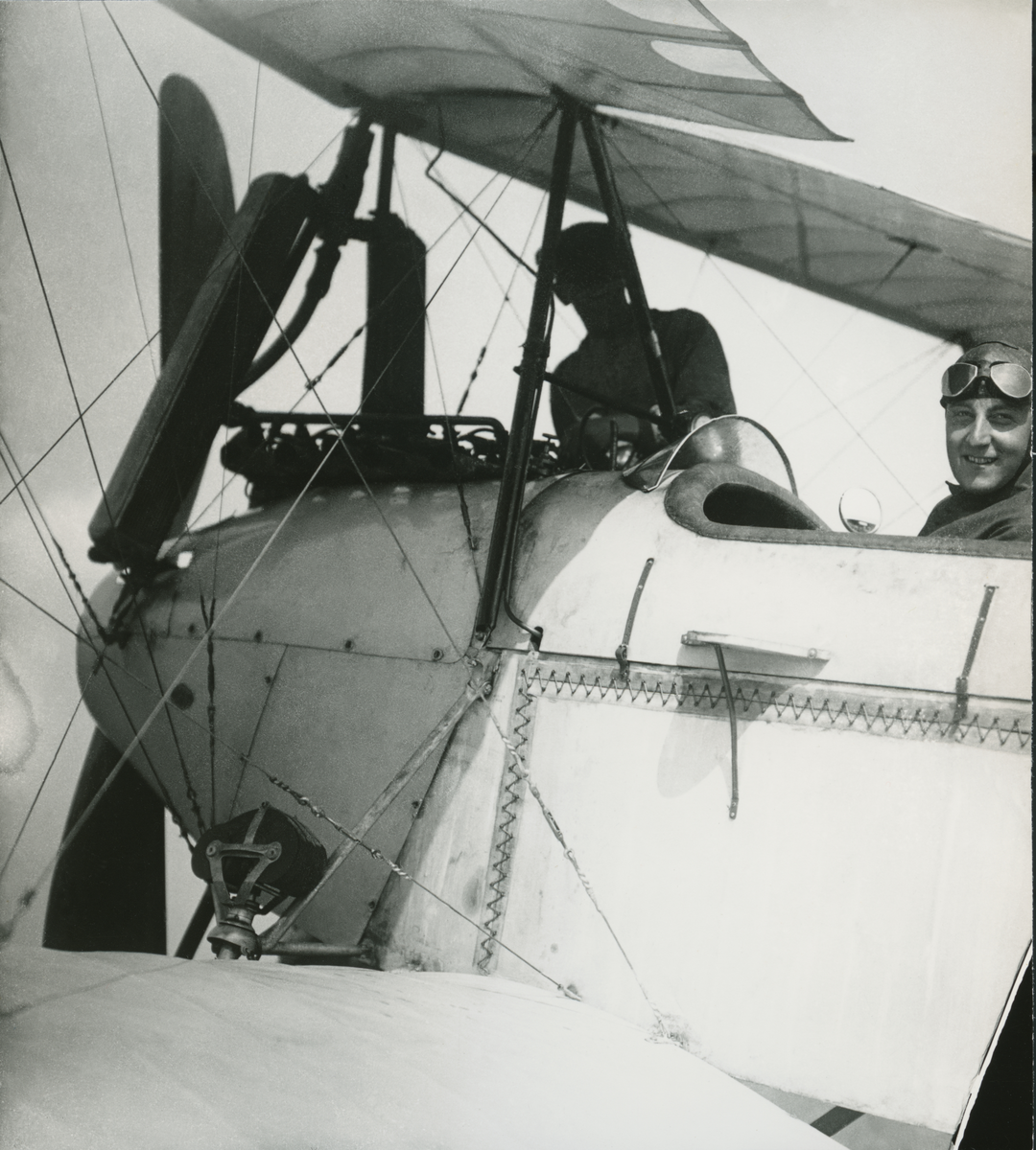 Flygförare Edmund Sparmann sitter i flygplan Lohner Pfeilflieger märkt 25 vid tävling i Österrike-Ungern. En mekaniker står på flygplanet. Vy från sidan.
