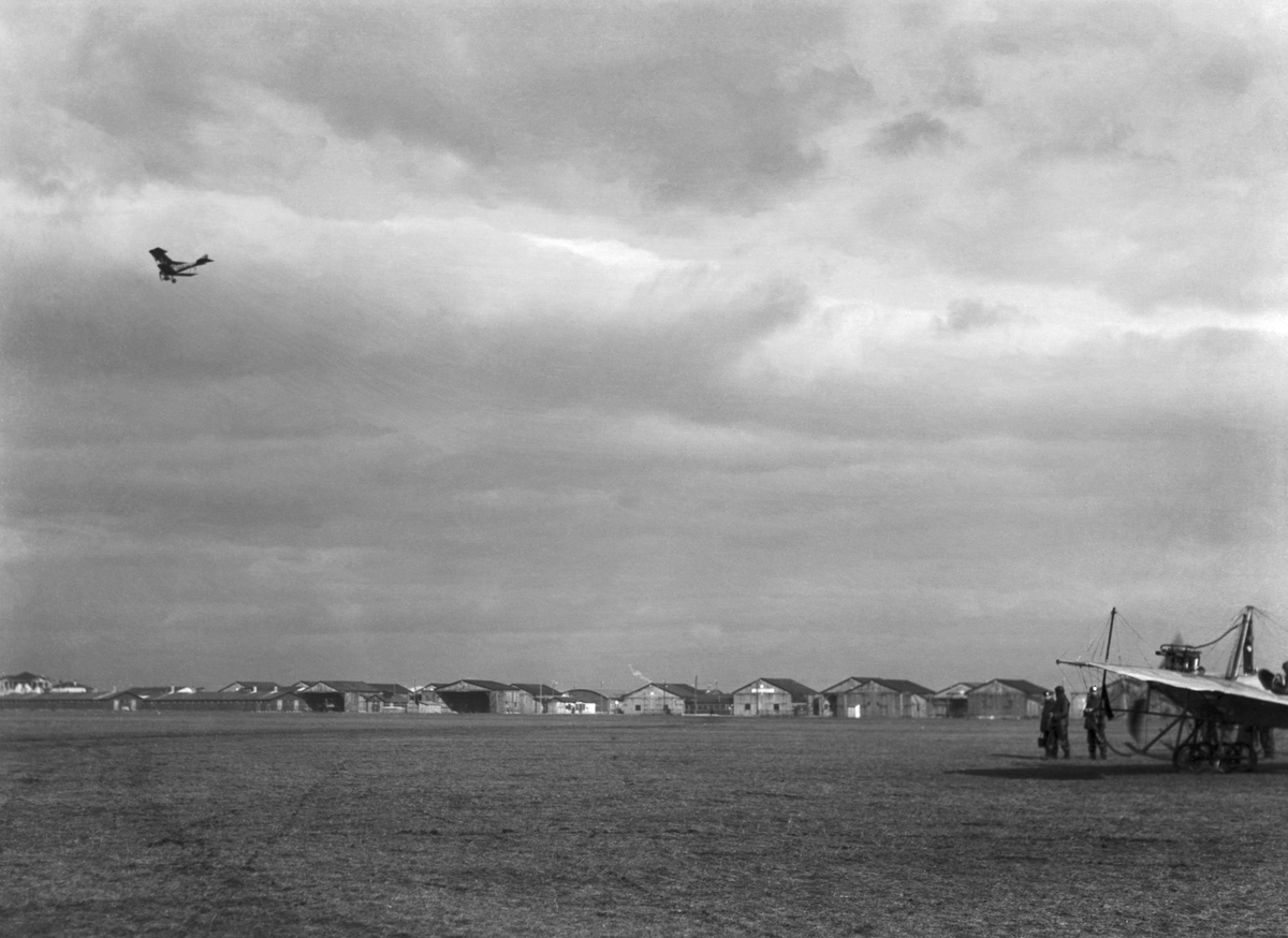 Vy av flygfält och hangarer i Österrike-Ungern under första världskriget. Ett flygplan i luften och ett på marken.