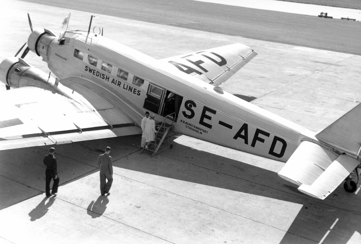Civilt passagerarflygplan Junkers Ju 52 nummer SE-AFD tillhörande AB Aerotransport på Bromma flygplats.