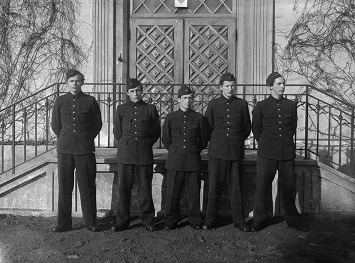 Grupporträtt av fem elever vid korpralskolan på F 2, 1944. Torpedmekaniker vid trappa.