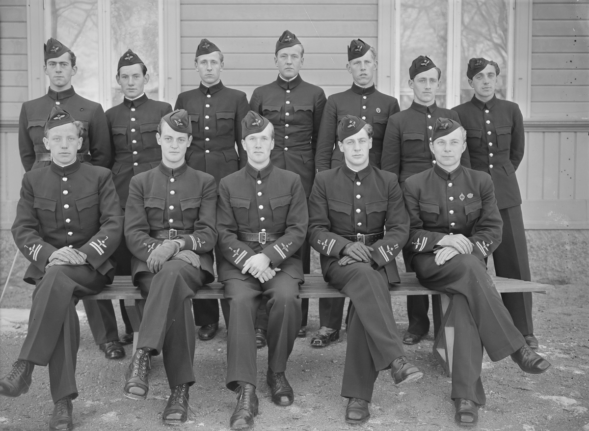 Elever vid furirskolan på F 3 Östgöta flygflottilj, 1941. Logement 6. Grupporträtt framför byggnad.