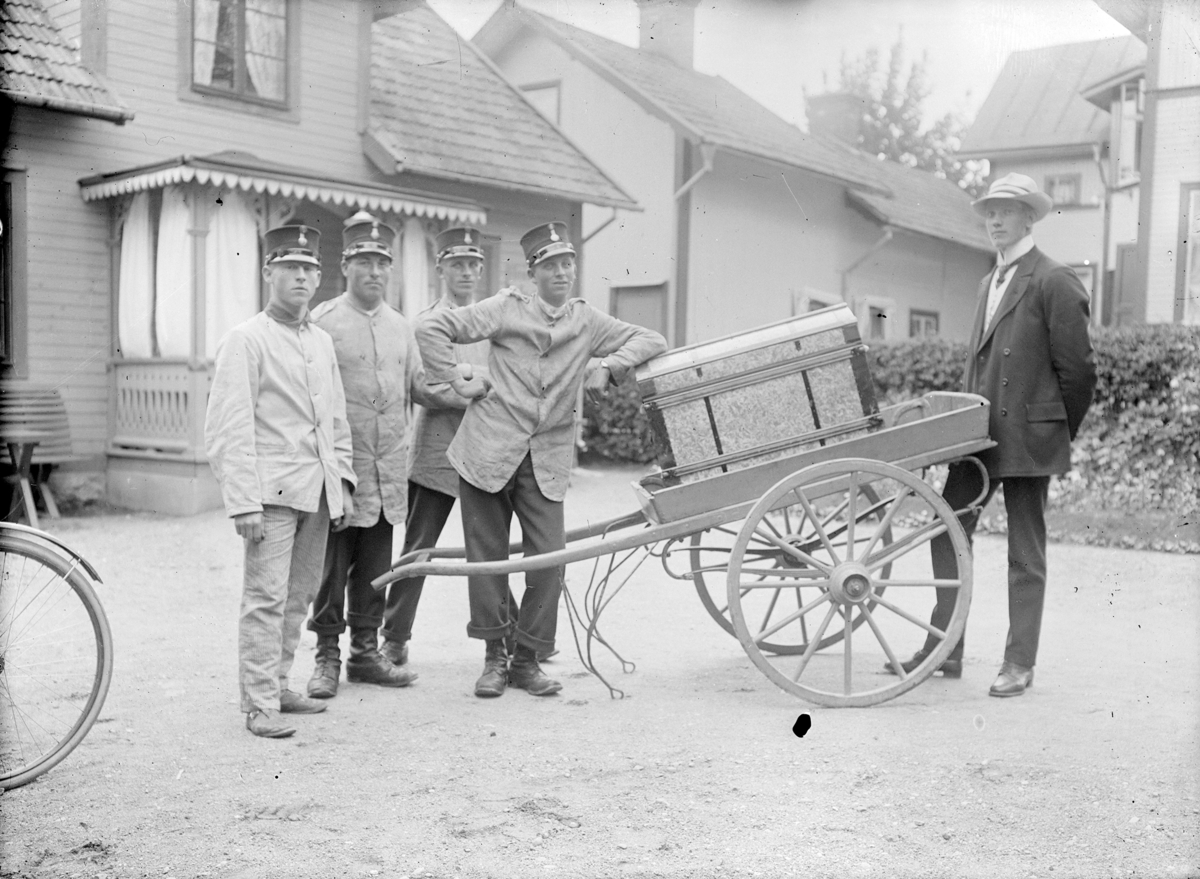Grupporträtt. Fyra armésoldater och en civilklädd man står vid en kärra med koffert på i Malmslätt. Mannen längst till vänster är Ernst Axfors. Soldaterna tillhör I 4 och / eller I 5 regemente.