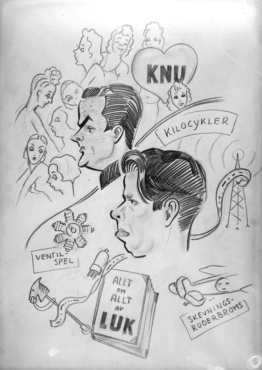 Karikatyrbild av militärer ur flygvapnet, 1930-tal. Märkt 'KNU', 'LUK'. Avfotograferad teckning.