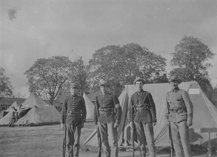 Fyra militärer med gevär framför tält på förläggning, 1920-tal.