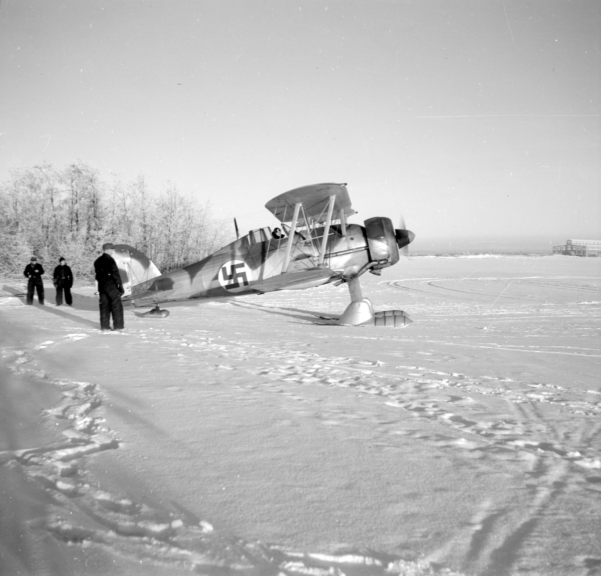 Flygplan Gloster Gladiator klar för start från F 19, Svenska frivilligkåren i Finland. Vy från sidan. Med flygförare Åke Söderberg i förarplats.