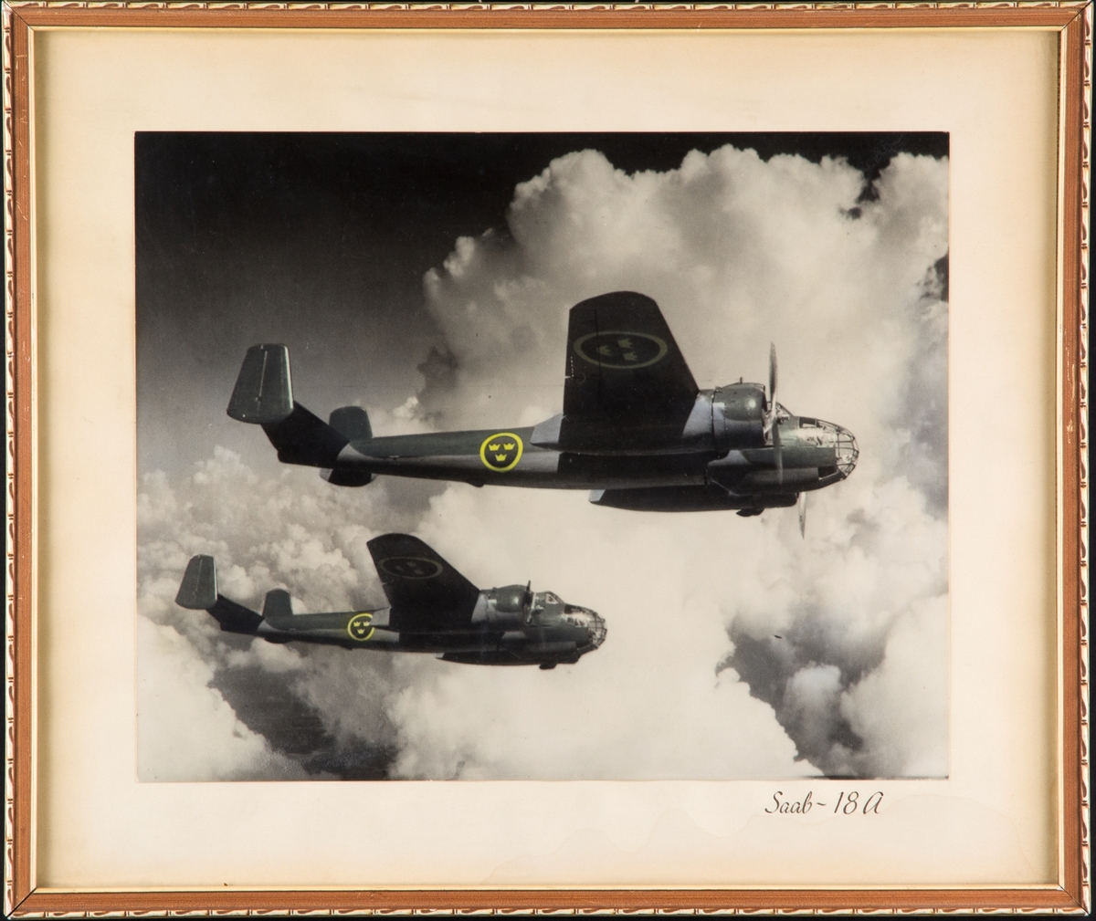 Två stycken flygplan B 18 i formationsflygning. Kolorerat foto.