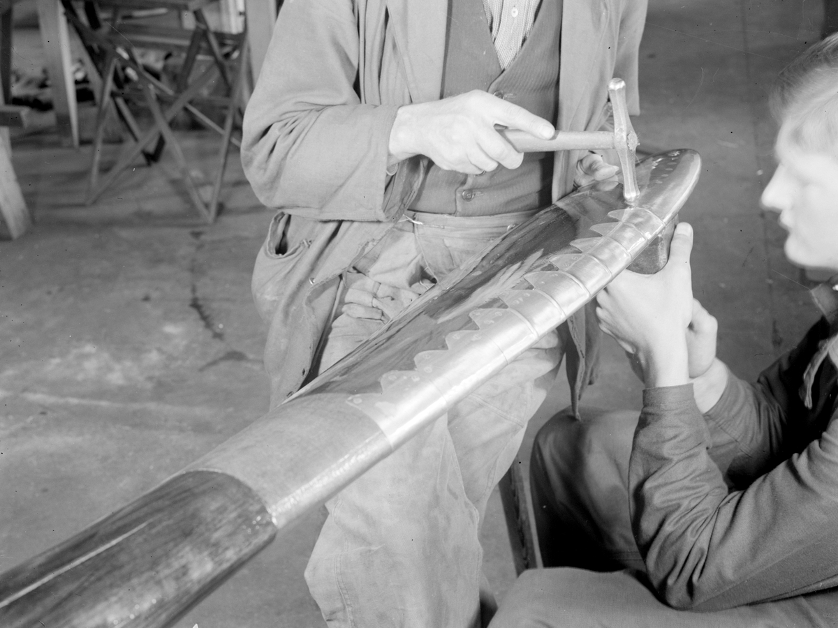 Tillverkning av träpropeller till flygplan på flygverkstäderna i Malmslätt. Två män i samarbete.