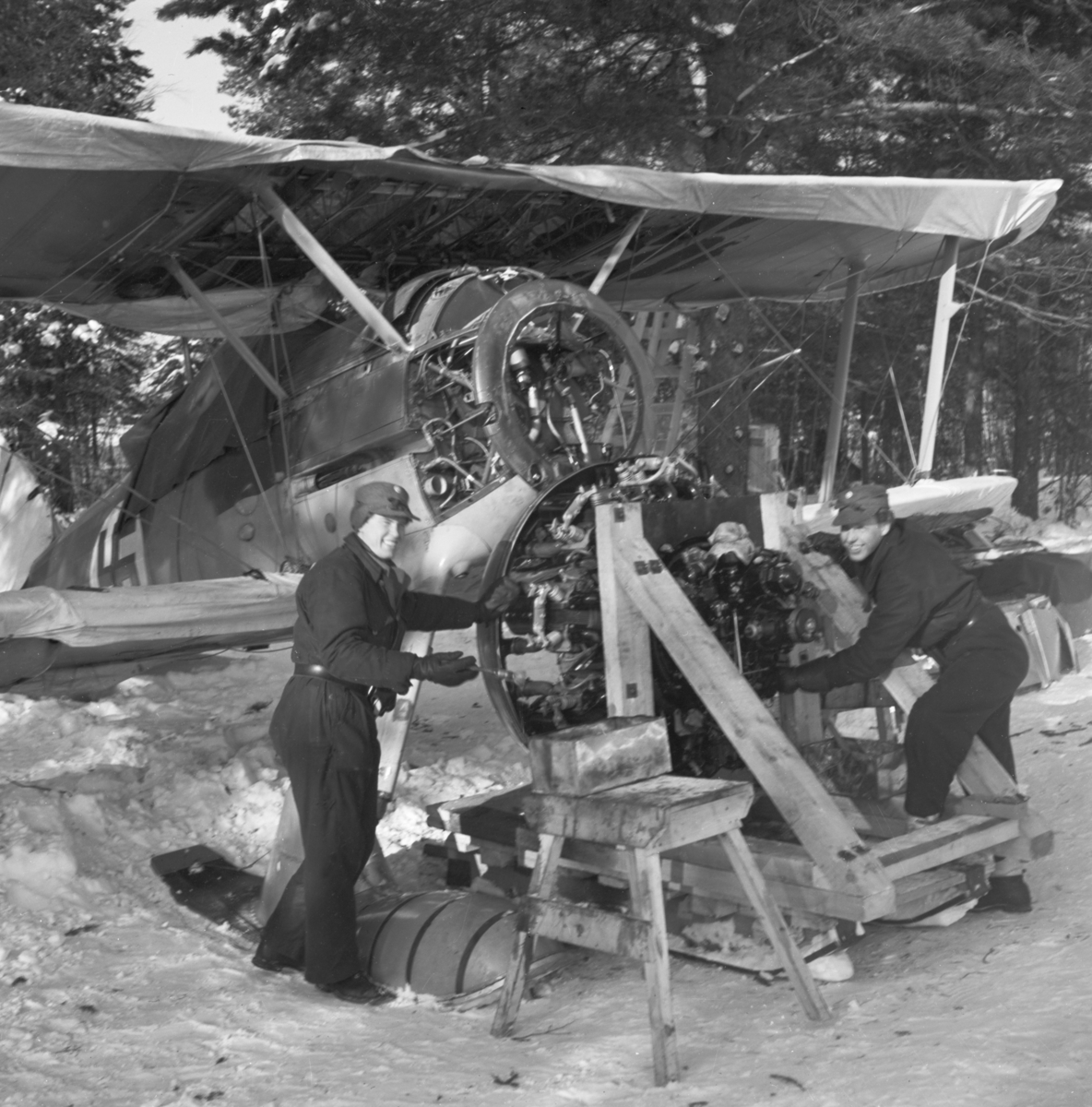 Reparation av motor på flygplan Gloster Gladiator gul I vid F 19, Svenska frivilligkåren i Finland. Två mekaniker i arbete.