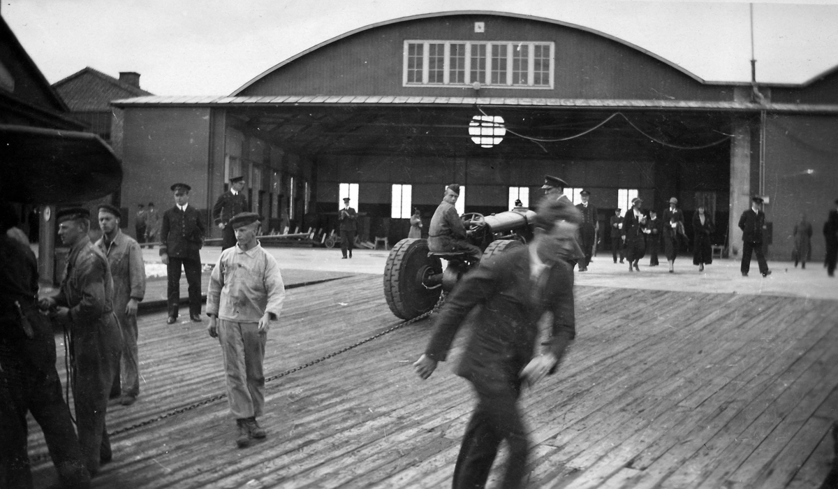 En traktor drar upp Charles Lindberghs flygplan på en slip vid dennes besök på F 2 Karlskrona flygstation på Stumholmen i september 1933. Folksamling i rörelse.