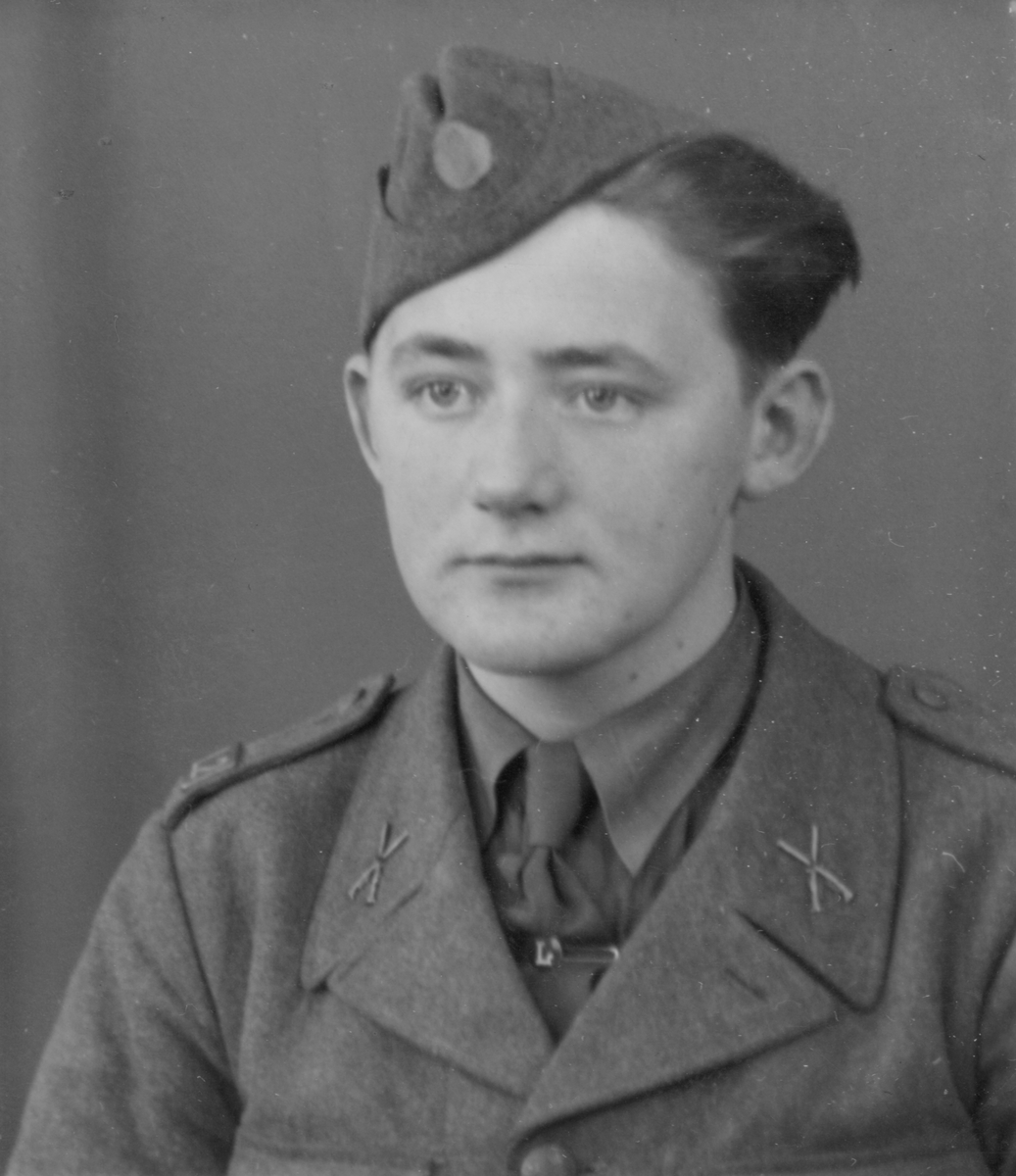 Porträtt av Gunnar Lundin, frivillig luftbevakare vid 2:a landstormsregemente L 2 under beredskapstiden, klädd i uniform med mössa.