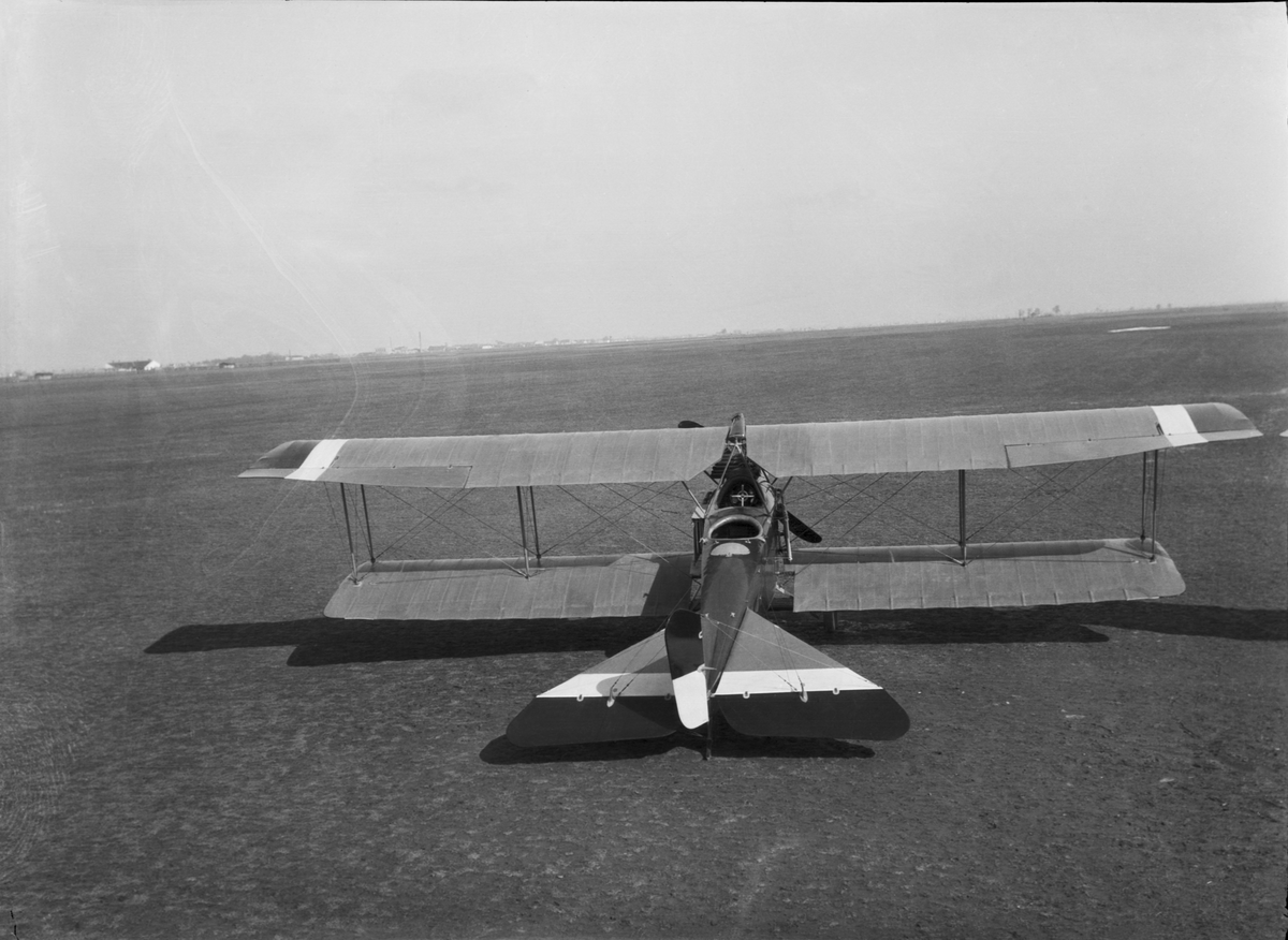Militärt flygplan Albatros B.I tillhörande Österrike-Ungern står på ett flygfält. Vy från ovan, bakifrån.