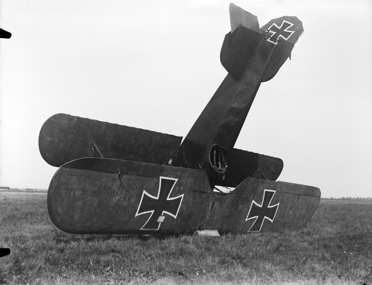 Militärt flygplan Phönix D.I märkt 122.06 tillhörande Österrike-Ungern står på nosen på ett fält, efter haveri. Vy framifrån.