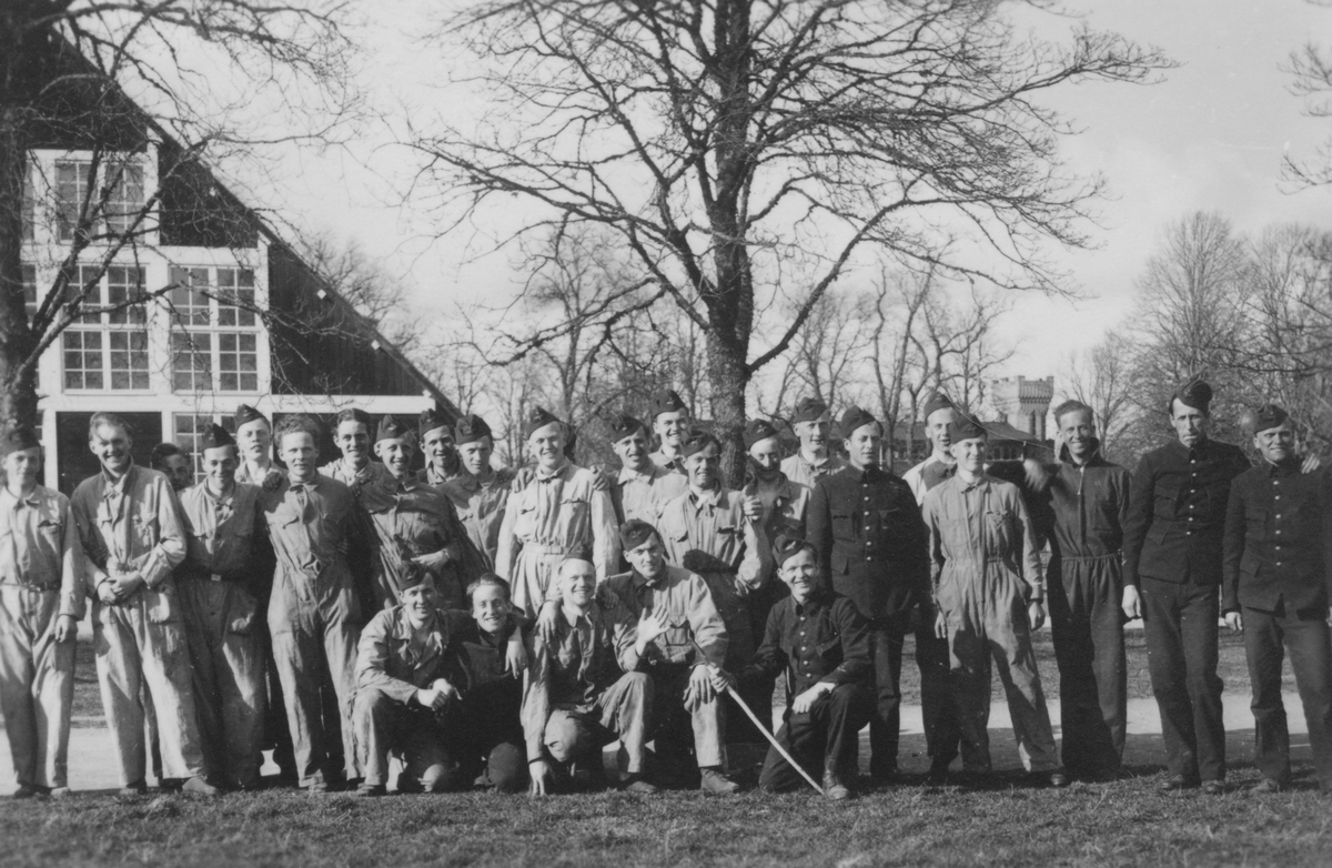 Gruppfotografi utomhus, 27 yngre män i flygvapenoveraller och uniformer. Placerade framför militär byggnad.