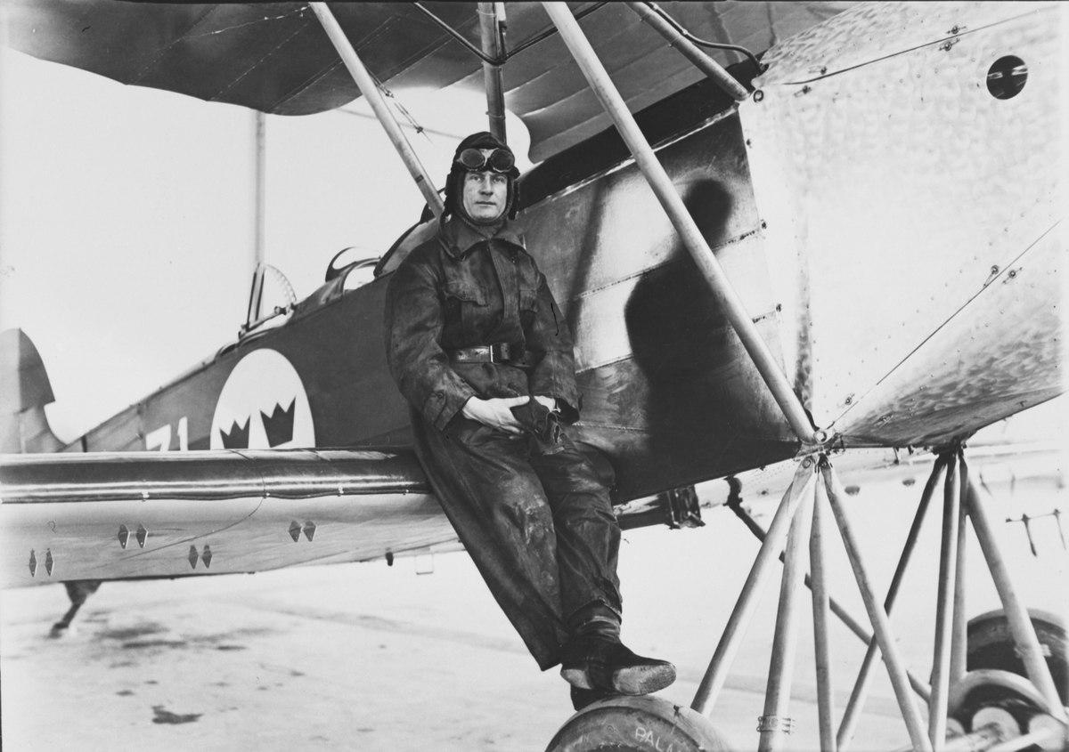 Porträttfotografi av militära flygaren Einar Lundborg vid flygplan S 6 Fokker nr 31, 1928.
