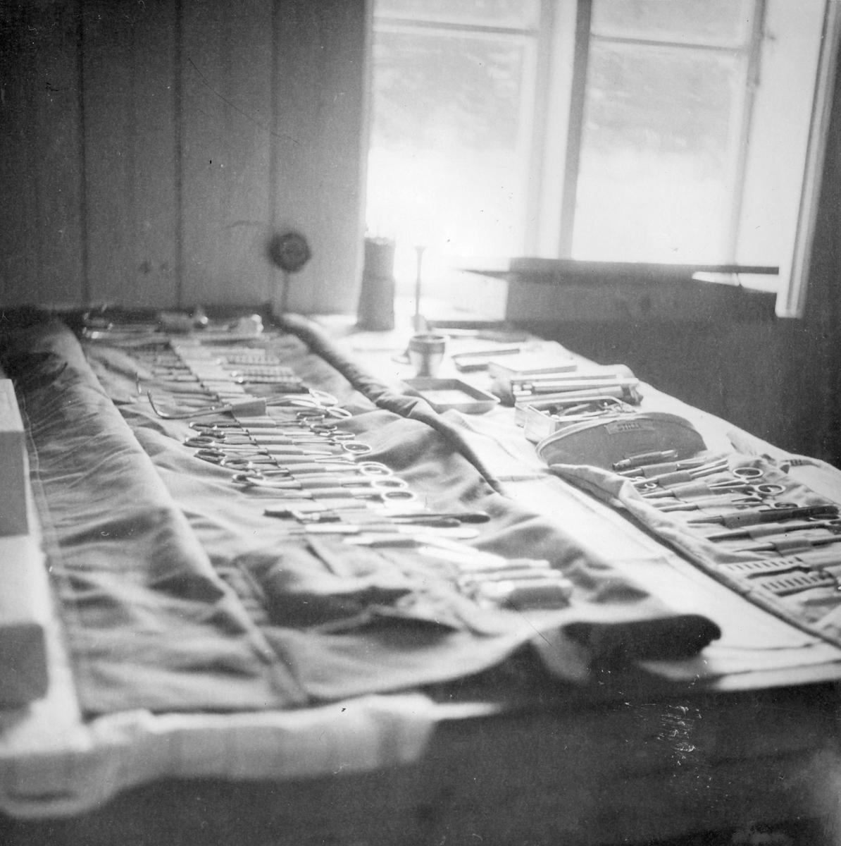 Kirurgiska instrument tillhörande sjukvårdsutrustning vid F 11 Södermanlands flygflottilj, 1945.