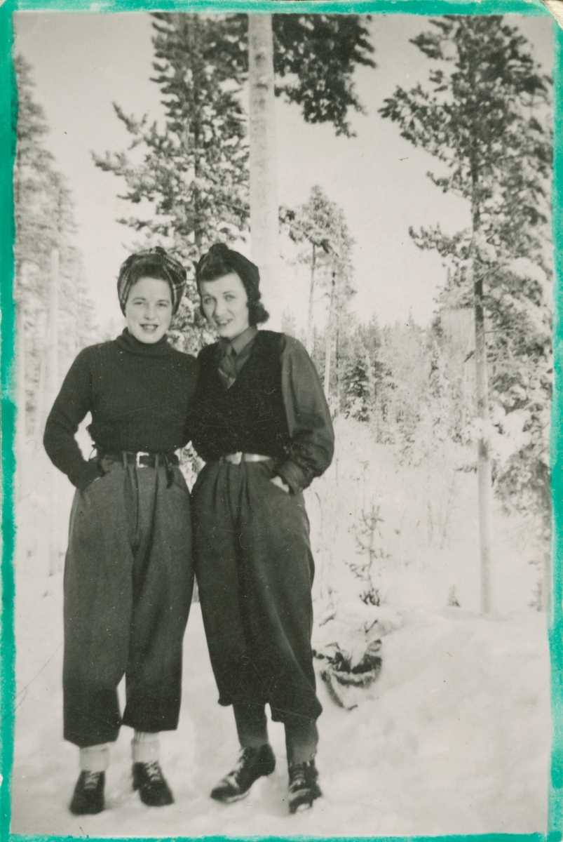 Porträtt av luftbevakare Karin Nordberg och Karin Olsson stående utomhus, vintern 1942. Vid luftbevakningsstationen för 91:a ls-kompaniet i Tellejåkk, Kåbdalis under beredskapsåren.