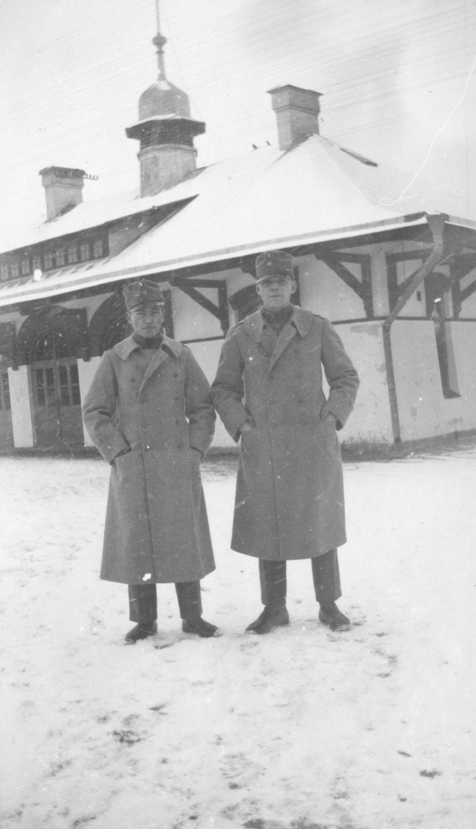 Grupporträtt. Två militärer står framför stationshuset i Malmslätt, vintertid.