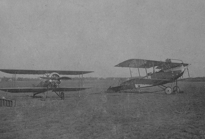 Flygplan Tummeliten och FVM S 18 står på ett flygfält.
