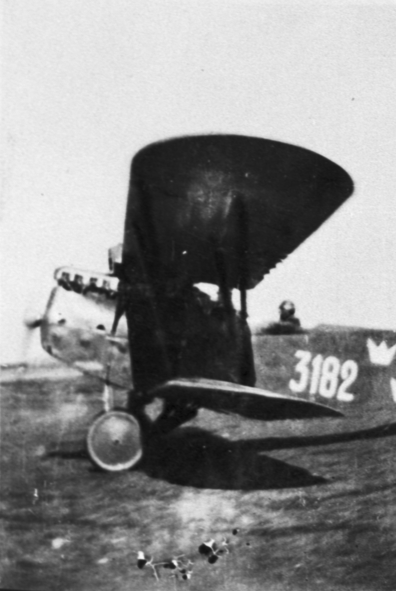 Flygplan Phönix C.I Dront märkt 3182 tillhörande Flygkompaniet står på ett fält. Flygförare sitter i flygplanet och motorn är igång. Vy från sidan.