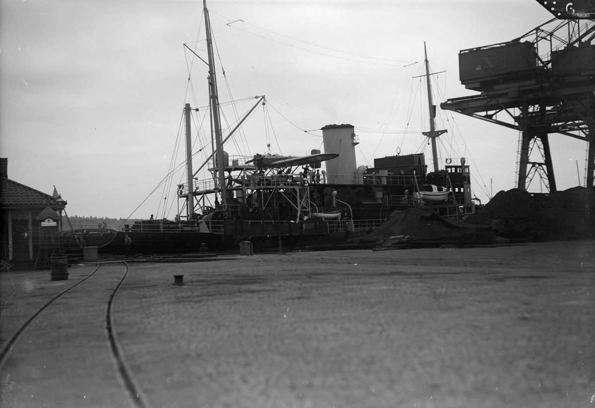 Flygplan S 5 lyfts med kran till ett fartygsdäck. Flygplanet på fartygsdäck.