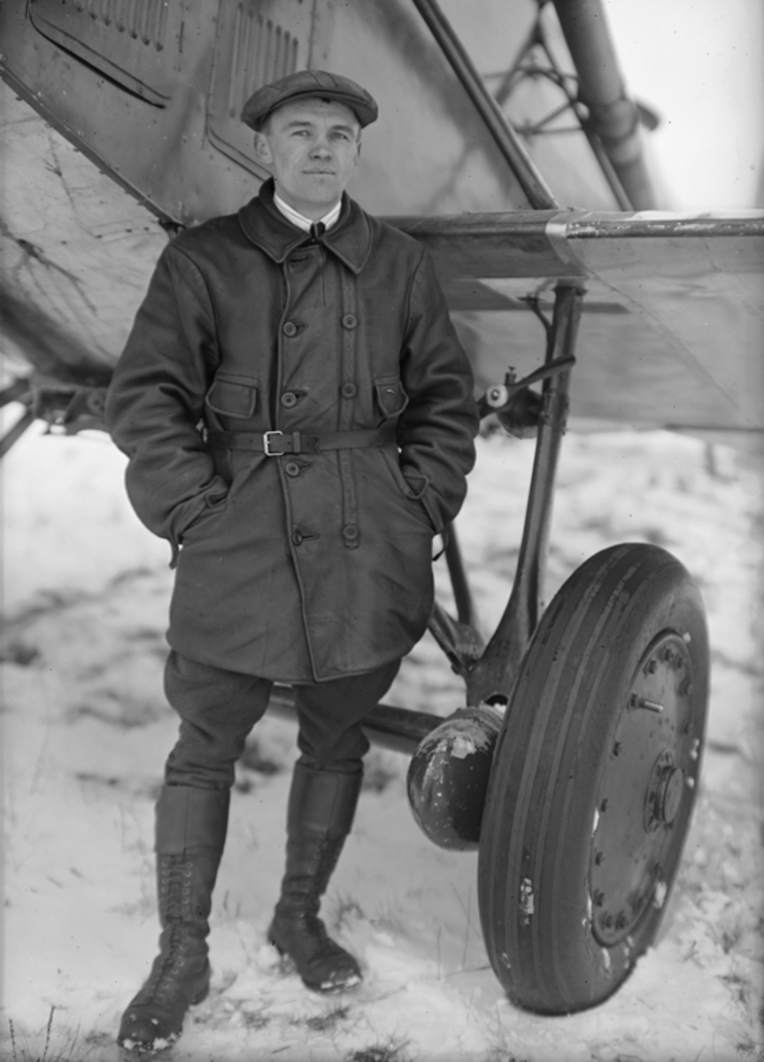 Porträtt av tyghantverkare Walter vid flygplan B 2 på Malmen.