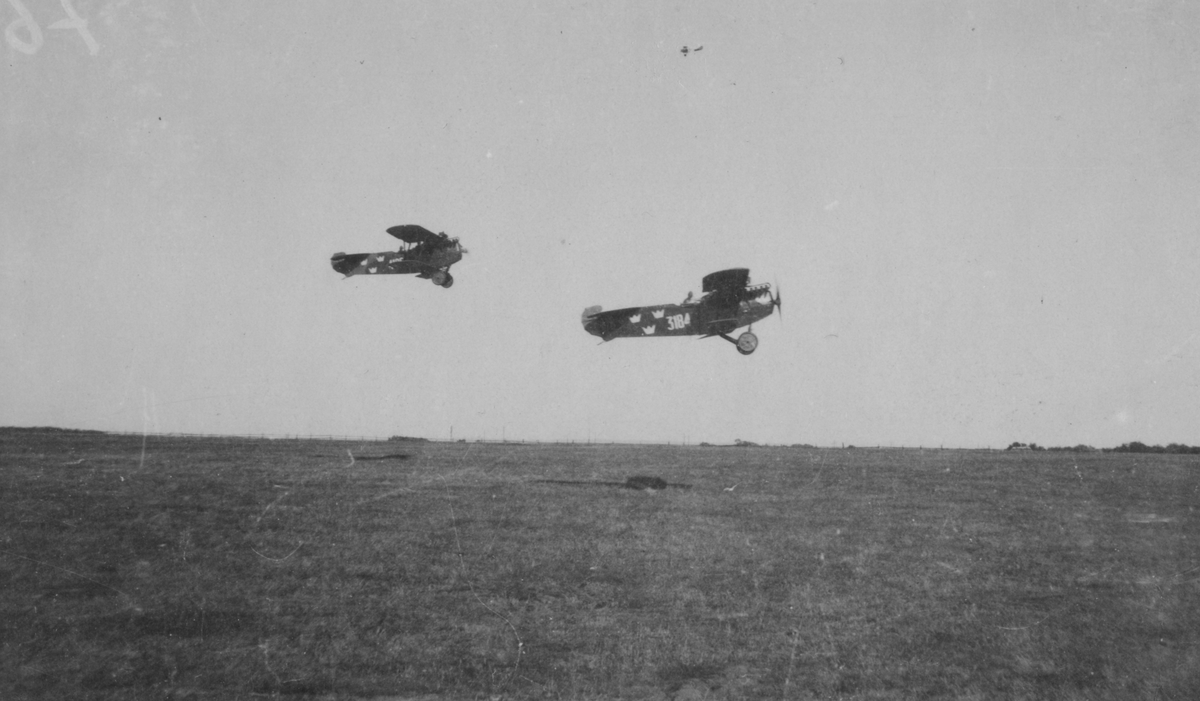 Två flygplan Phönix C.I Dront flyger på låg höjd över ett fält. Till höger flygplan nummer 3184