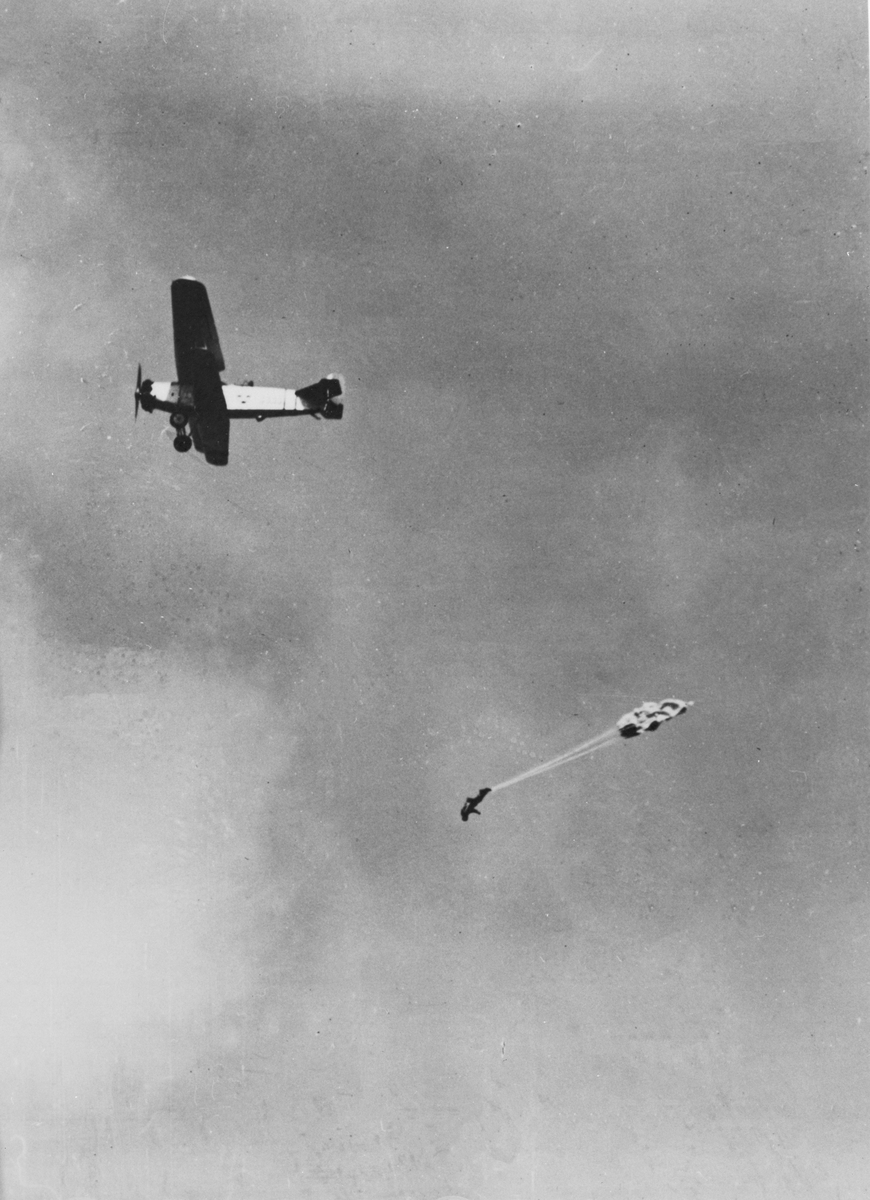 Fallskärmsprov, hopp från flygplan S 6 Fokker, tidigt 1930-tal.